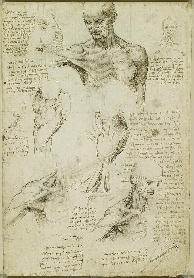“…[H]e drew muscles, blood, bones, organs, and blood vessels from different angles, and he pioneered the method of depicting them in multiple layers, like the transparencies of body layers found in encyclopedias centuries later.”