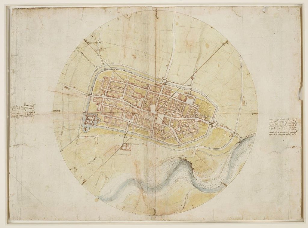 While employed by Cesare Borgia, Leonardo lived in Imola, in northern Italy — a key stronghold at the time. Leonardo used innovative techniques to make a map (fig. 87) of the city that was “accurate, detailed, and easily read[able].” The map was of great tactical use, as commanders could use it to plan troop movements, siege tactics, and defensive positions and reinforcements.